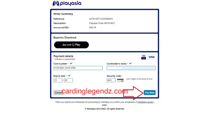 Insert one of the produced cards here (any random name is acceptable; the only thing that needs to be genuine is the CC you generated with your bin) and click on Pay.